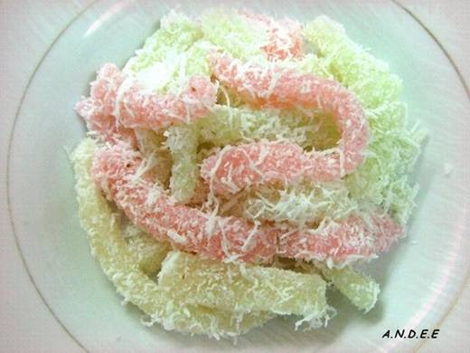 Khoai mì mài ra lấy bột đem lọc kỹ, để ráo sẽ cắt thành sợi dài mà dẹp, hấp chín rồi cũng trộn chung với dừa khô nạo nhuyễn là sẽ thành món bánh tằm khoai mì trộn dừa, muốn có màu sắc hồi đó người bán không dùng màu hóa chất mà lấy màu xanh của lá dứa, màu tím của lá cẩm, màu đỏ của trái gấc chín, nên những sợi bánh tằm ăn vào mỗi màu có một mùi thơm riêng biệt, vì vậy ăn ít ngán hơn.